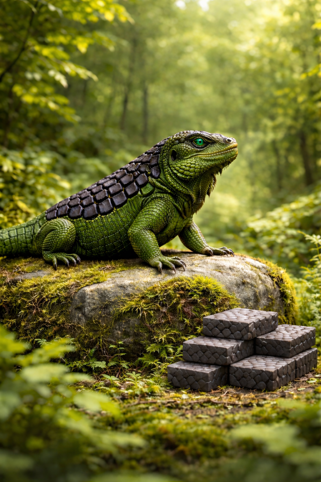 Unlike mechanical carbon capture systems that require significant energy and infrastructure, the KarboLizard represents a self-sustaining biological approach. It processes CO2 through specialized respiratory organs, separates the carbon atoms, and deposits them into its mineralized scales. These scales can then be harvested as permanent carbon storage materials called "carbon bricks."